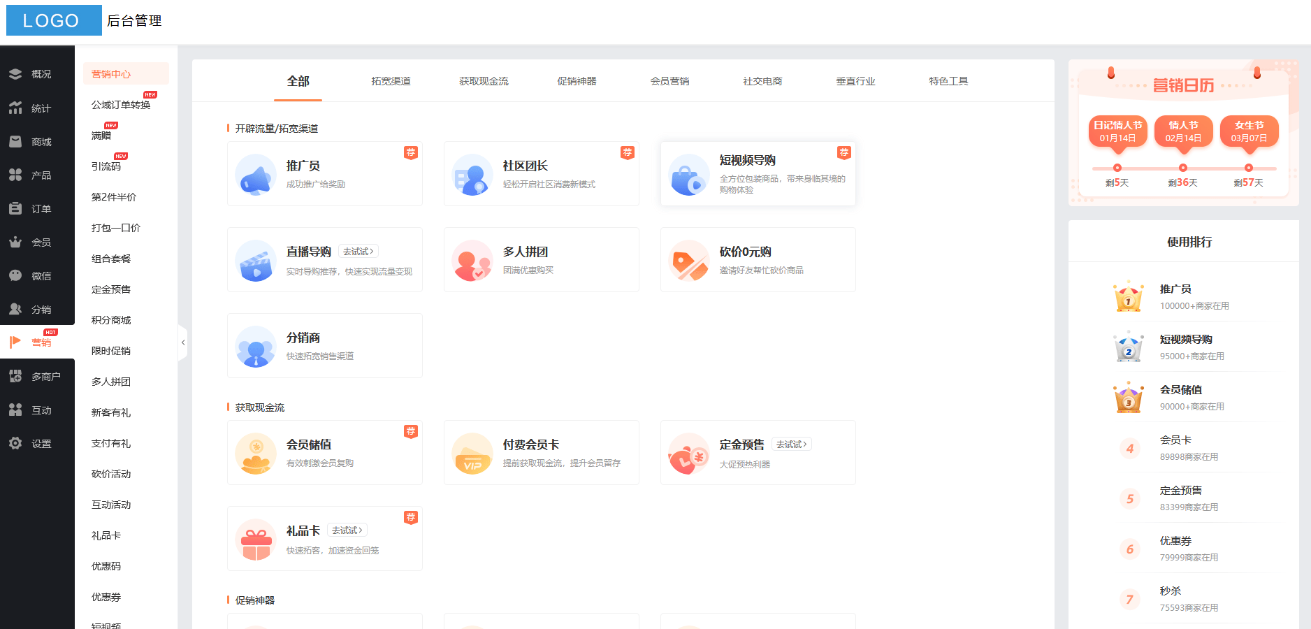 比如会员储值、积分商城、拼团、秒杀、分销等。