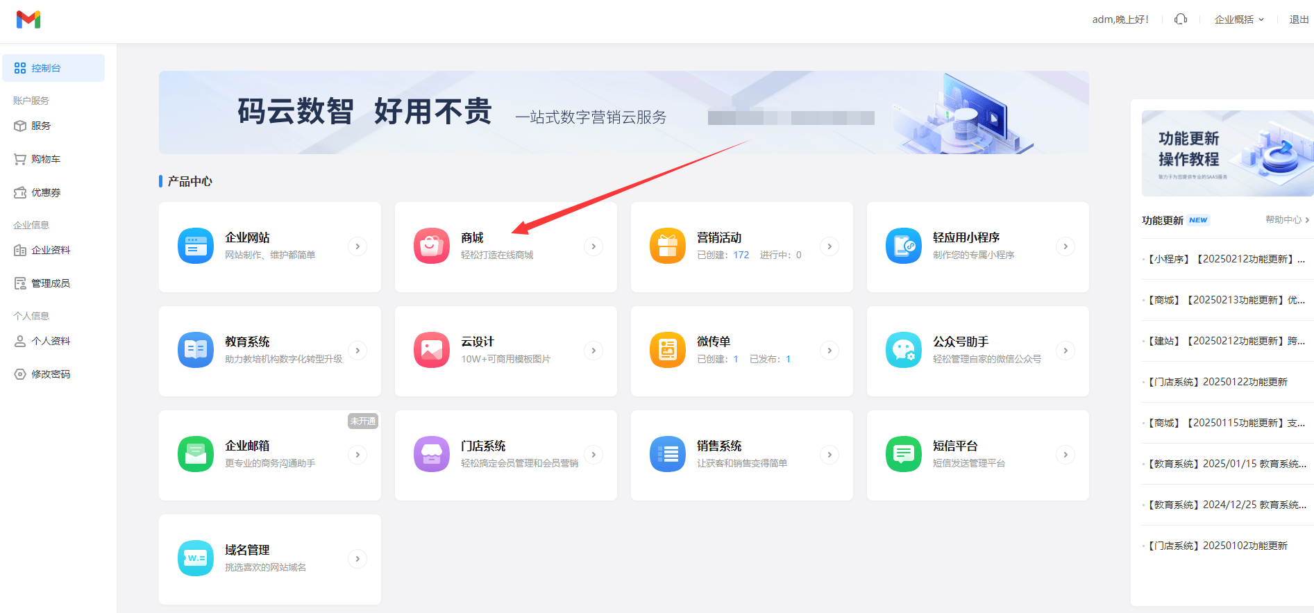 百度搜索【码云数智】,在【码云数智】平台注册账号,产品类型选择-商城