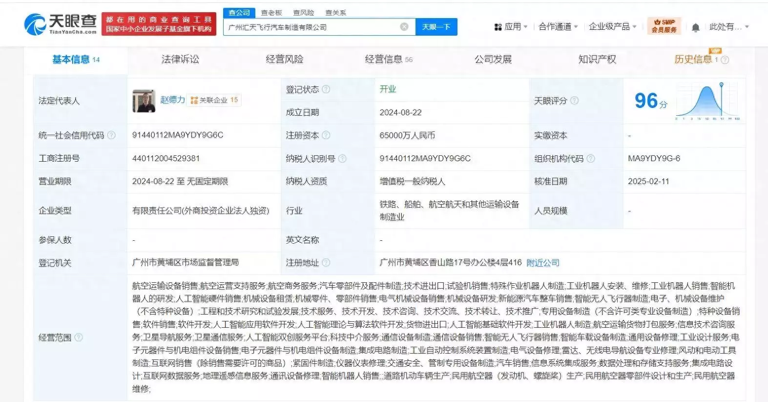该公司成立于2024年8月,法定代表人为赵德力,经营范围含航空运输设备销售、航空运营支持服务、航空商务服务、汽车零部件及配件制造、特殊作业机器人制造、智能机器人的研发、人工智能硬件销售、智能无人飞行器制造等。股权全景穿透图显示,该公司由广东汇天飞行汽车有限公司全资持股,后者为小鹏汽车旗下HT Flying Car (Hong Kong) Limited全资子公司。