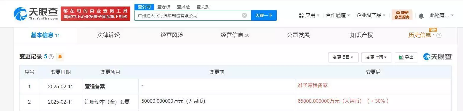 天眼查App显示,近日,广州汇天飞行汽车制造有限公司发生工商变更,注册资本由5亿人民币增至6.5亿人民币,增幅30%。