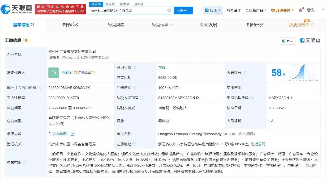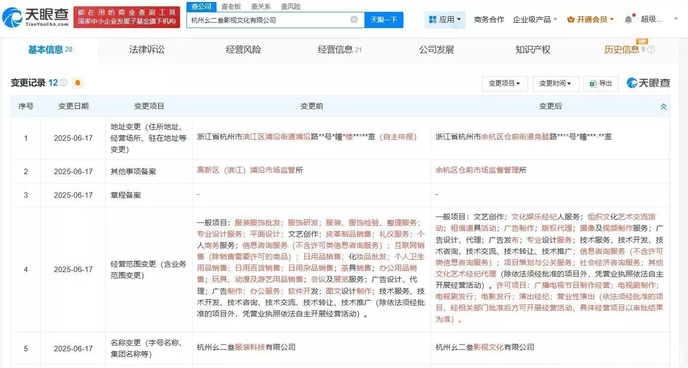 天眼查App显示,近日,杭州幺二叁服装科技有限公司发生工商变更,企业名称变更为杭州幺二叁影视文化有限公司,同时经营范围新增文艺创作、文化娱乐经纪人服务、演出经纪等。