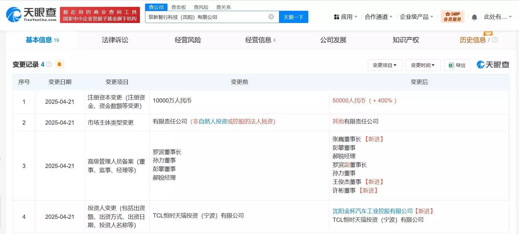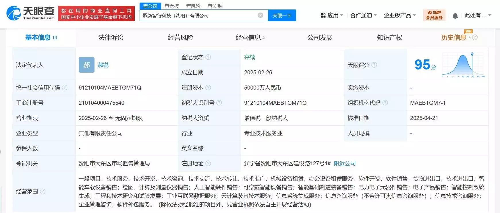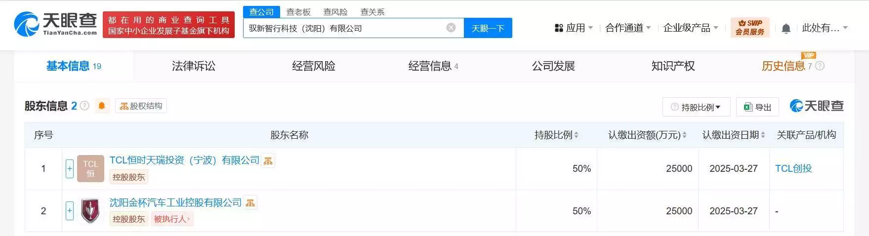 驭新智行科技(沈阳)有限公司成立于2025年2月,法定代表人为郝锐,经营范围含机械设备租赁、智能车载设备销售、人工智能硬件销售、可穿戴智能设备销售、智能基础制造装备销售、智能控制系统集成、信息系统集成服务等。股东信息显示,该公司现由TCL恒时天瑞投资(宁波)有限公司、沈阳金杯汽车工业控股有限公司各持股50%。