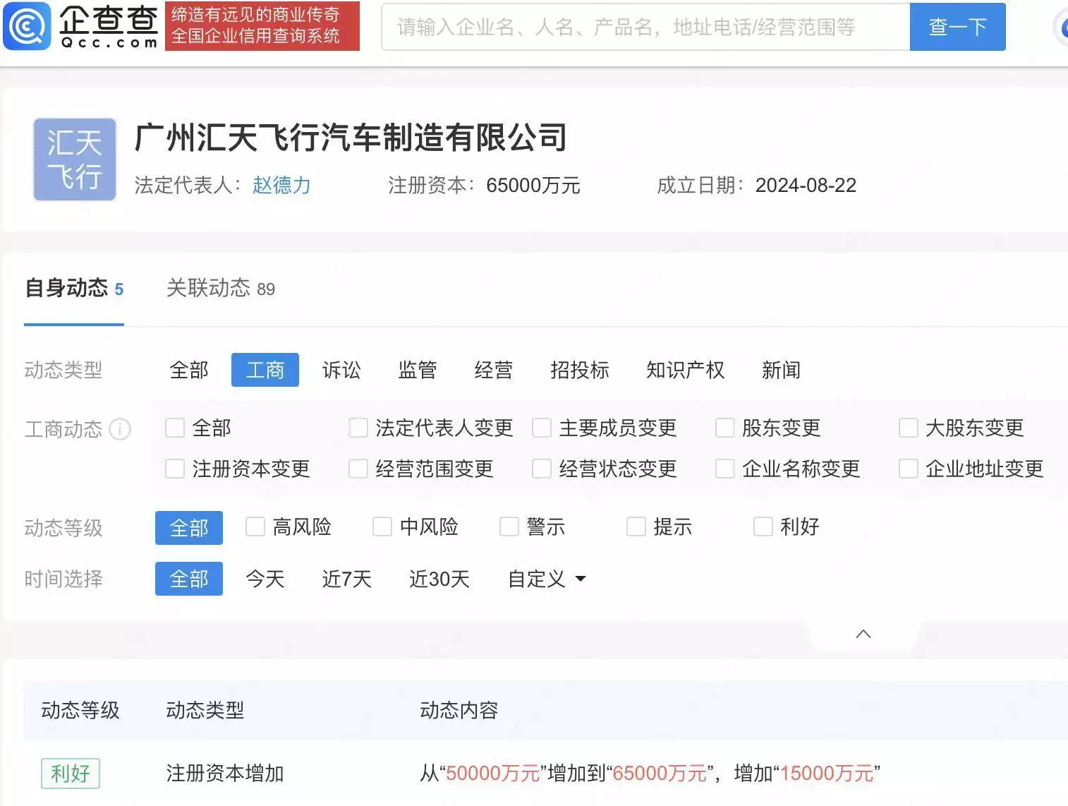 企查查APP显示,近日,广州汇天飞行汽车制造有限公司发生工商变更,注册资本由5亿人民币增至6.5亿元。企查查信息显示,该公司由广东汇天飞行汽车有限公司全资持股,后者为小鹏汽车旗下HT Flying Car (Hong Kong) Limited全资子公司。