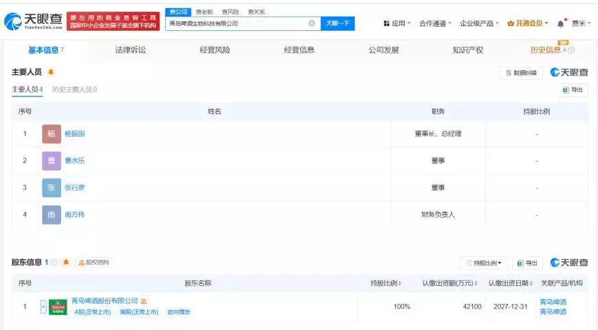 天眼查App显示,近日,青岛啤酒生物科技有限公司成立,法定代表人为杨振国,注册资本4.21亿人民币,经营范围包括食品生产、调味品生产、粮食加工食品生产、食品销售、道路货物运输、工业酶制剂研发等,由青岛啤酒(600600)全资持股。