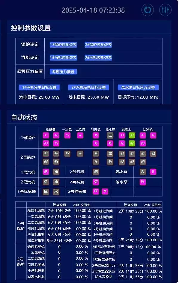 验证期内,锅炉给煤机、一二次风机、进汽阀等关键设备自动投用率达 100%,远超项目预期的 95%,彻底改变了以往依赖人工频繁干预的局面。锅炉给煤、一二次风、引风以及汽机等关键控制模块实现全自动运行,主蒸汽压力、主蒸汽温度、炉膛负压等关键参数的波动幅度大幅减小,为下游生产提供了更加稳定可靠的能源供应。