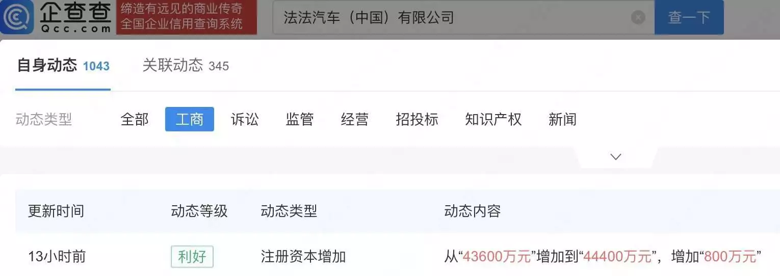 企查查APP显示,近日,法法汽车(中国)有限公司发生工商变更,注册资本由4.36亿人民币增至4.44亿人民币。企查查信息显示,该公司成立于2017年,法定代表人为王志刚,经营范围包括汽车销售、新能源汽车整车销售、汽车零部件及配件制造等,由FF Hong Kong Holding Limited、乐视汽车科技(北京)有限公司共同持股。