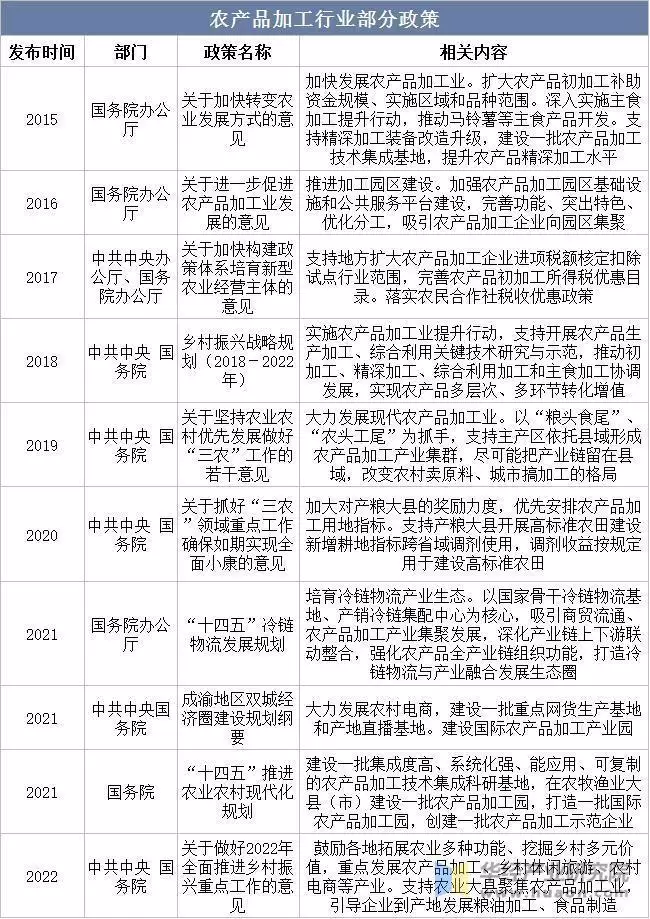 农产品加工是农产品由生产领域进入消费领域的一个重要环节,已成为农业现代化的支撑力量和国民经济的重要产业,对促进农业提质增效、农民就业增收和农村一二三产业融合发展,对提高人民群众生活质量和健康水平、保持经济平稳较快增长发挥了十分重要的作用。近年来国家出台了一系列政策支持农产品加工业的发展,为大米深加工行业的发展提供了良好的政策环境。
