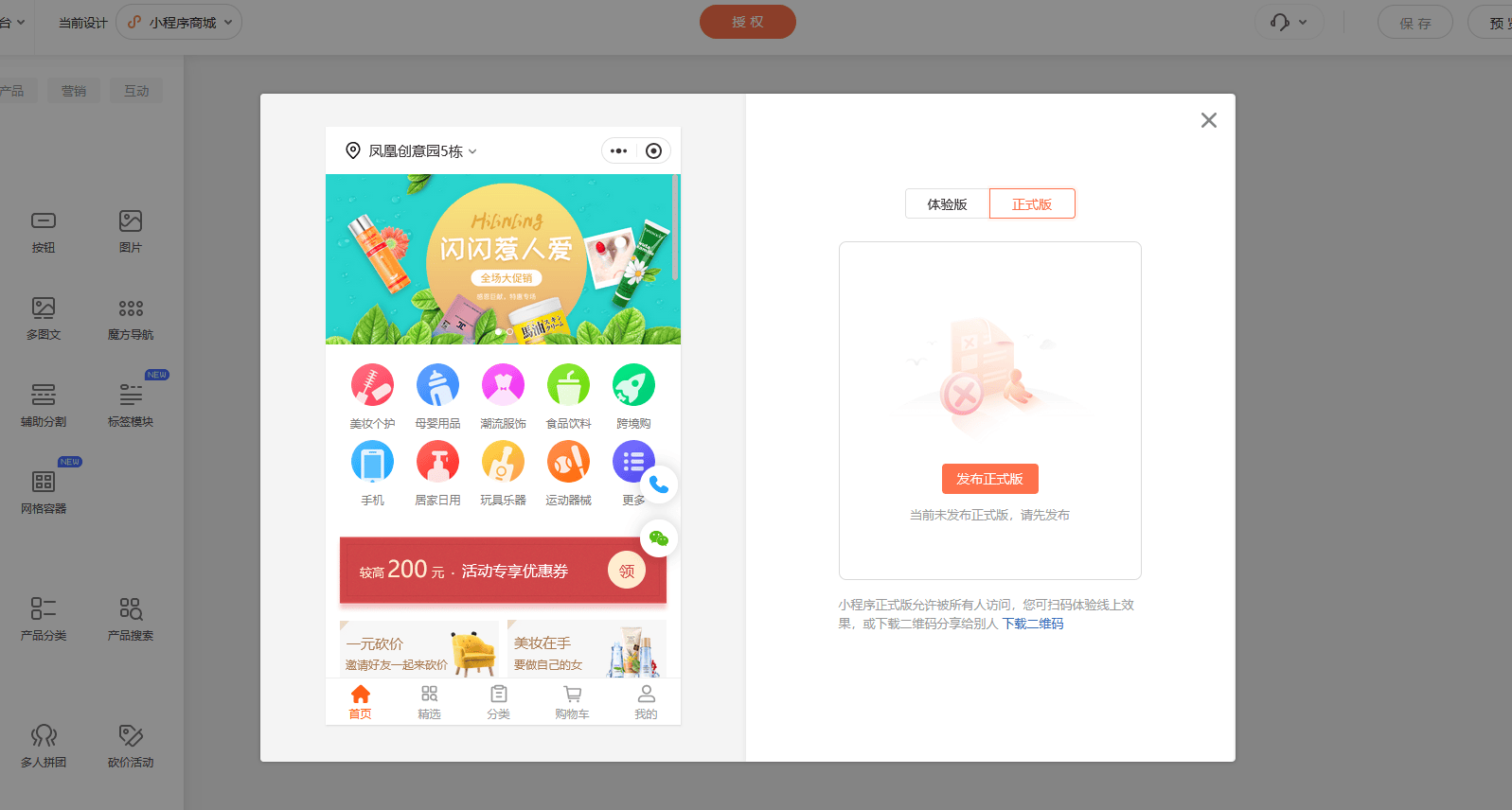 这个是它的官网,右上角我们看到有个注册账号,这里我们可以点击注册账号,注册我们的体验账号,注册完之后点击登录这里进入到产品中心,这里我们要选择这个商城,如果是我们做线上的销售,这种电商类型的,可以选择这种商城小程序。这个也是最常用的一种类型,点击进入到它的后台,就这个样子,左侧它的一些功能设置,这边是装修设计,它的界面有小程序生成、手机生成、电脑生成三个端口呢。我们可以选择性地开启,如果是一般默认的话是小程序商城,如果其他两个端口需要开启的话,也可以进行开启。