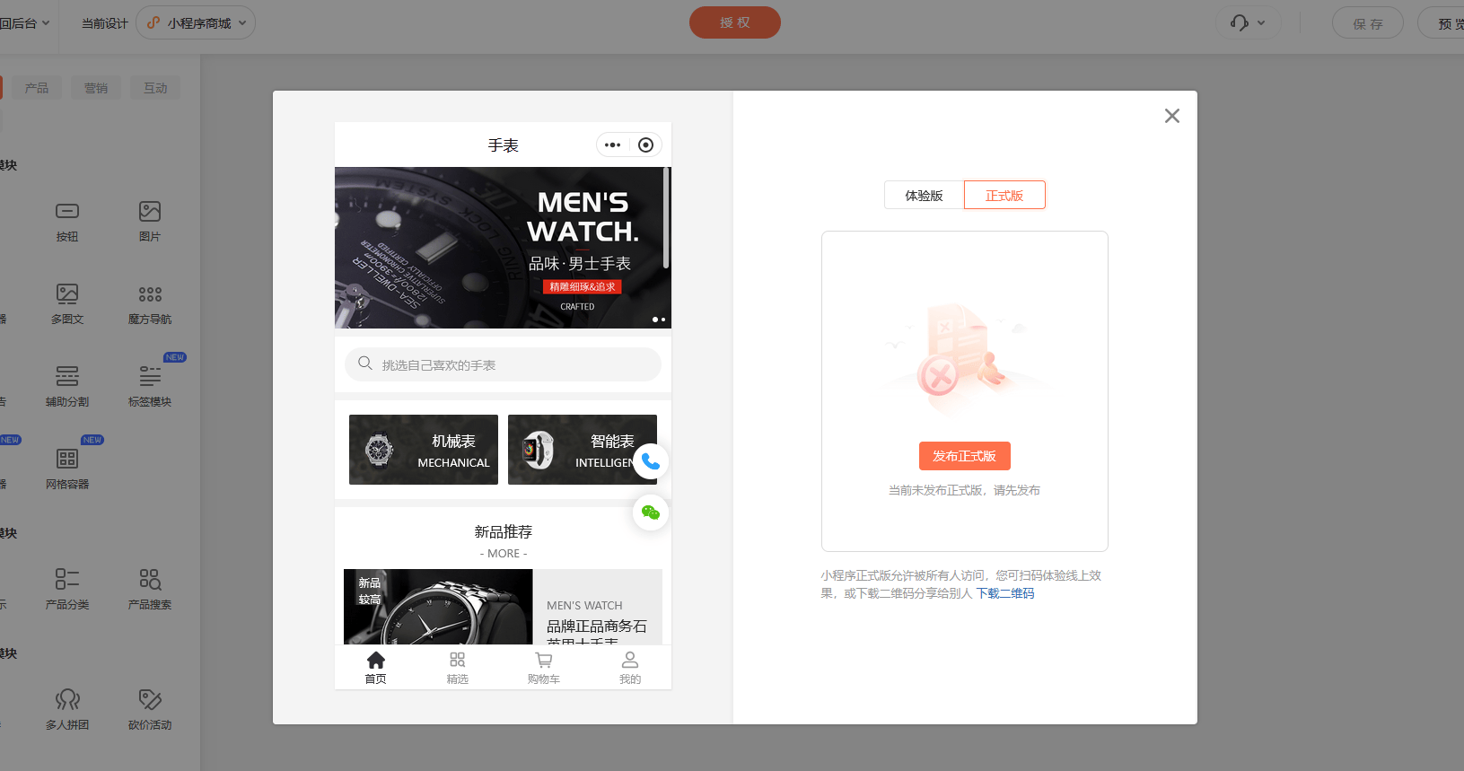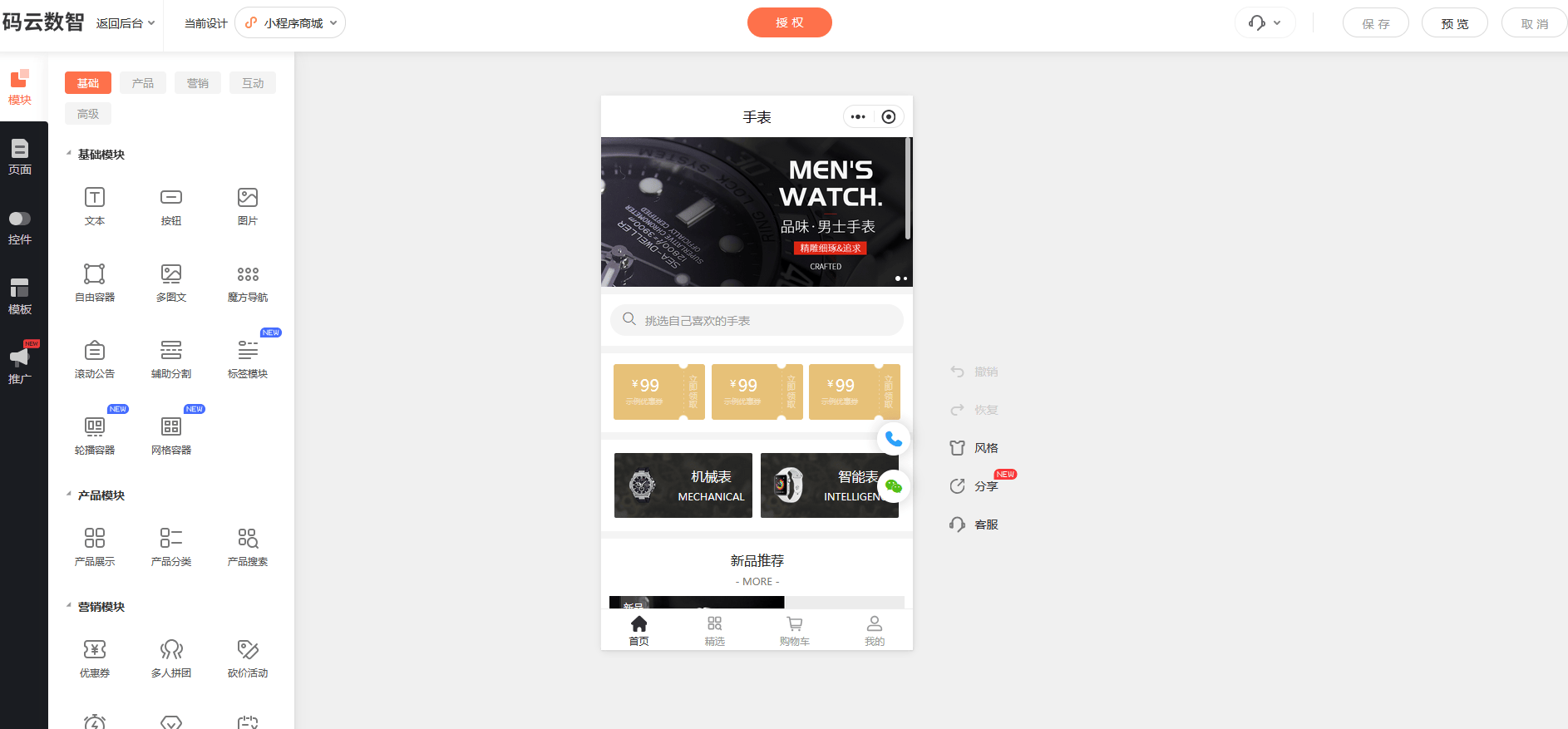点击概况,点击装修,这个就是装修界面,我们添加好产品,设置好一些规则,我们这边就可以设计它的界面。而且比如说我先要对应的位置添加产品模块,就可以拖拽到对应的位置,然后这里可以选择指定的产品,也可以按照这个产品分类去添加。比如说我们刚才如果是有设置一些积分的商城,我们看到这个营销模块里面就会有积分商城,然后直接拖拽到对应的位置,这里又增加了积分的商城。当然我们刚才没有创建,如果是创建之后,这里面都会有积分商城添加这些产品,我们可以直接去,然后选择显示对应的产品,设置完之后保存。返回搜狐,查看更多