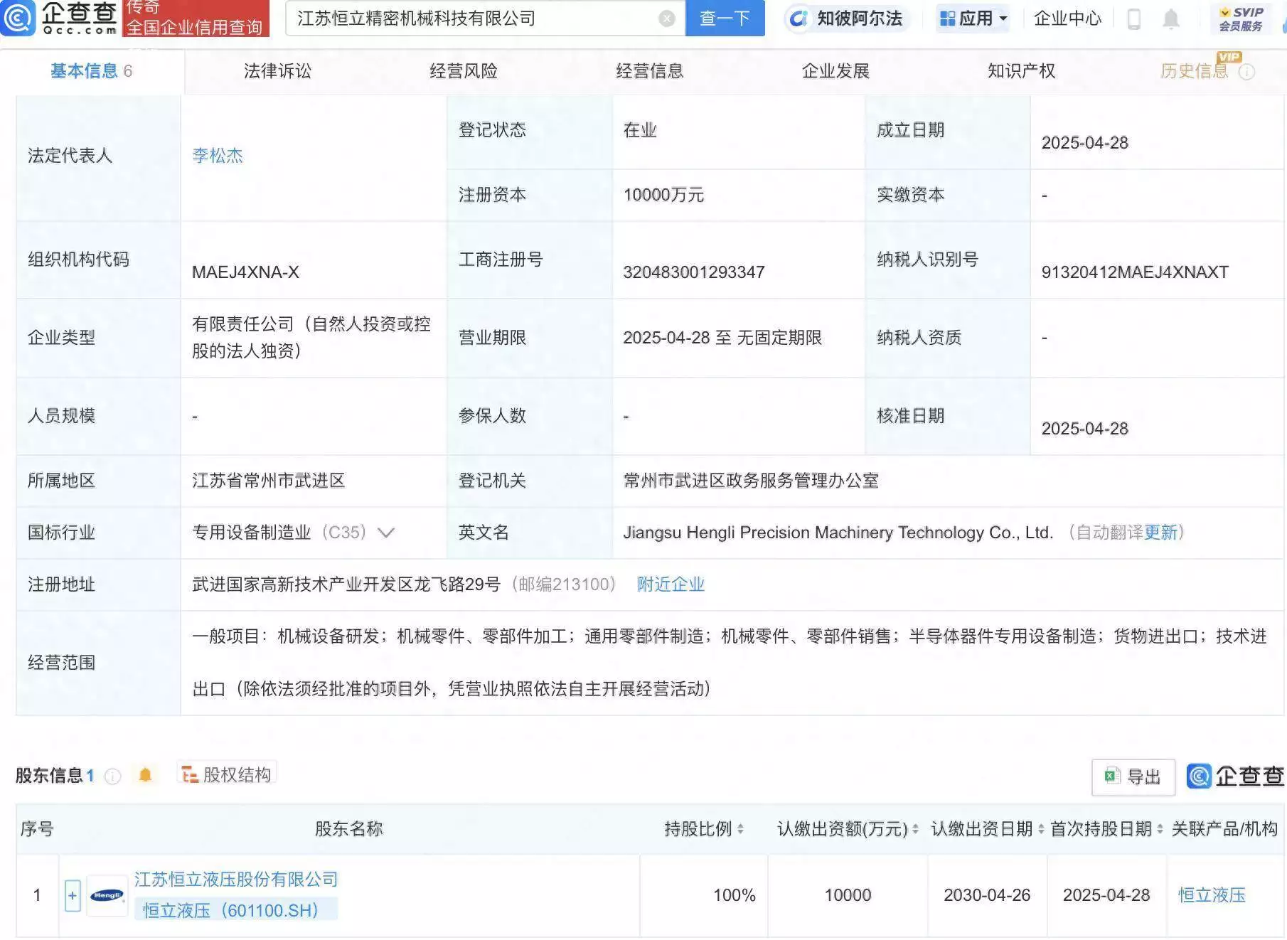 企查查APP显示,近日,江苏恒立精密机械科技有限公司成立,法定代表人为李松杰,注册资本1亿元,经营范围包含:通用零部件制造;机械零件、零部件销售;半导体器件专用设备制造等。企查查股权穿透显示,该公司由恒立液压(601100)全资持股。