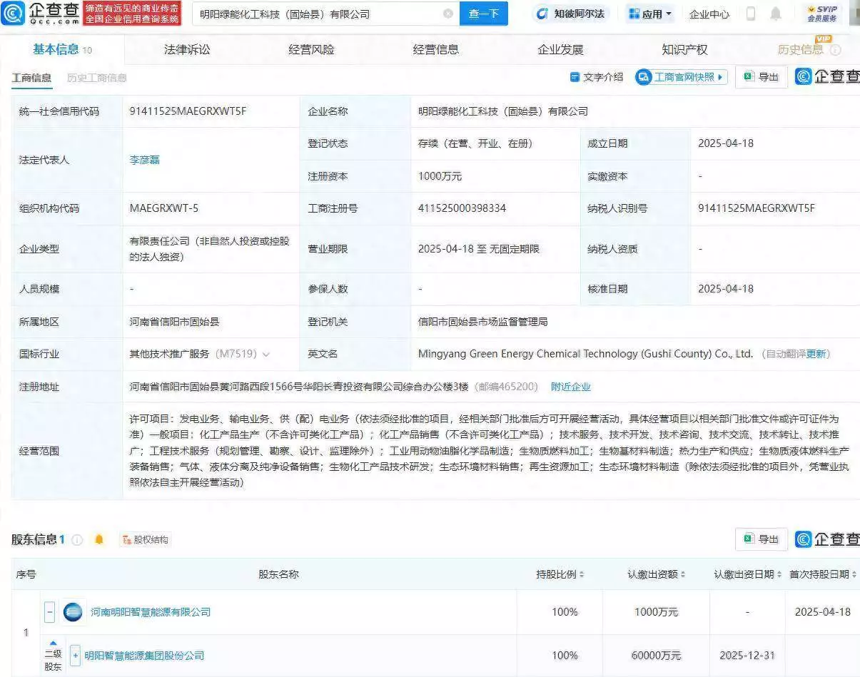 企查查APP显示,近日,明阳绿能化工科技(固始县)有限公司成立,法定代表人为李彦磊,注册资本为1000万元,经营范围包含:发电业务、输电业务、供(配)电业务;生物质燃料加工;生物基材料制造;热力生产和供应;生态环境材料销售等。企查查股权穿透显示,该公司由明阳智能(601615)间接全资持股。