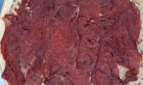 将贴好的肉片放入干燥箱,60-65摄氏度干燥4小时,中间要对肉片进行翻面,将烘干的肉片取出冷切剥离后,取得半成品。