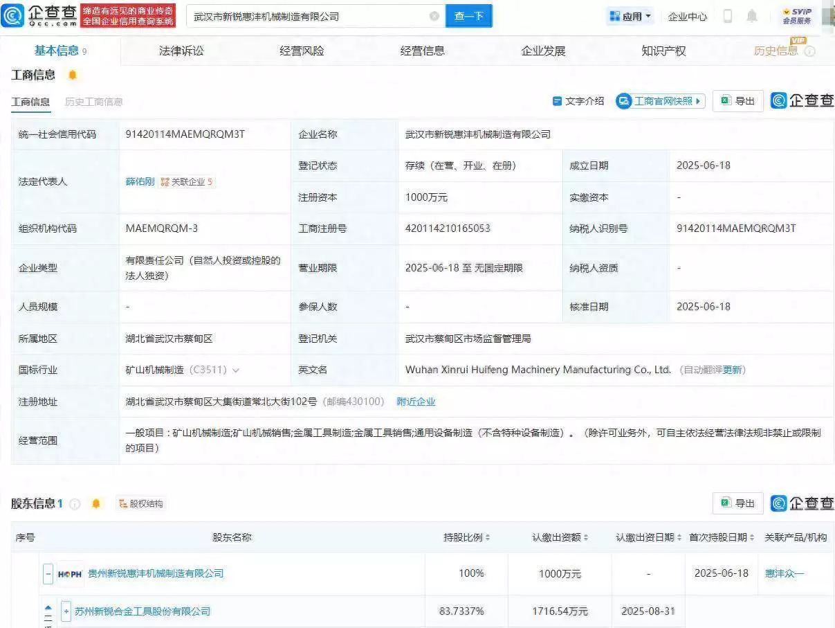 企查查APP显示,近日,武汉市新锐惠沣机械制造有限公司成立,法定代表人为薛佑刚,注册资本为1000万元,经营范围包含:矿山机械制造;矿山机械销售;金属工具制造;金属工具销售;通用设备制造。企查查股权穿透显示,该公司由新锐股份(688257)旗下贵州新锐惠沣机械制造有限公司全资持股。