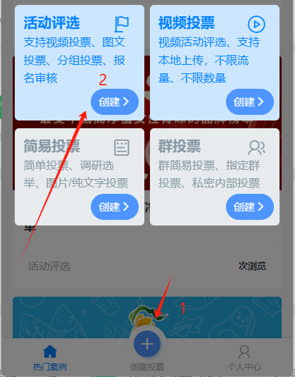 进入投票小程序首页,下拉到最底端,点击“创建投票”,进入选择投票模块界面,分几种模版(活动评选、视频投票、简易投票、群投票),模版不同,功能有所不同,像活动评选类型,能支持图文投票和视频投票混排,而且不限制投票选项,支持随时修改等功能。