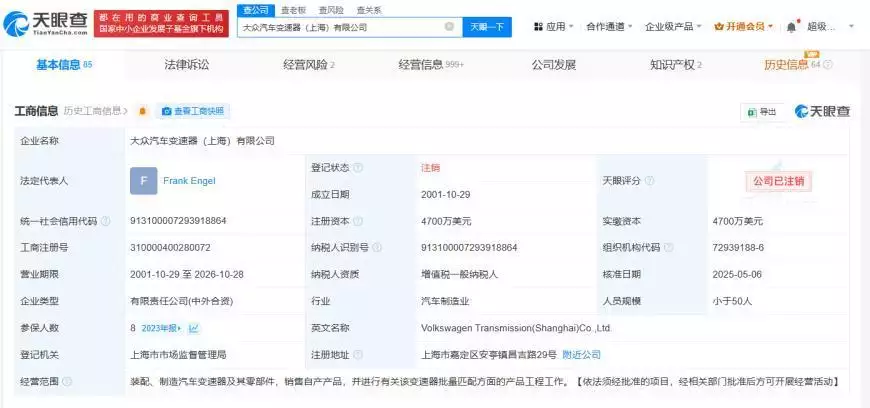 天眼查App显示,近日,大众汽车变速器(上海)有限公司登记状态由存续变更为注销。
