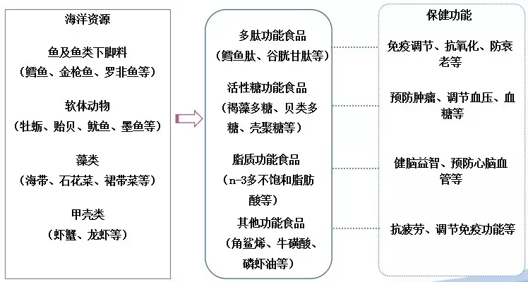 海洋生物资源因其独特的生存环境,具有丰富的营养和独特的功效作用,现已研究开发的主要功能物质如下: