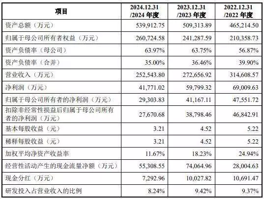 财务方面,于2022年度、2023年度、2024年度,宏明电子实现营业收入分别约为31.46亿元、27.27亿元、25.25亿元人民币;同期,净利润分别约为6.9亿元、5.98亿元、4.18亿元人民币。