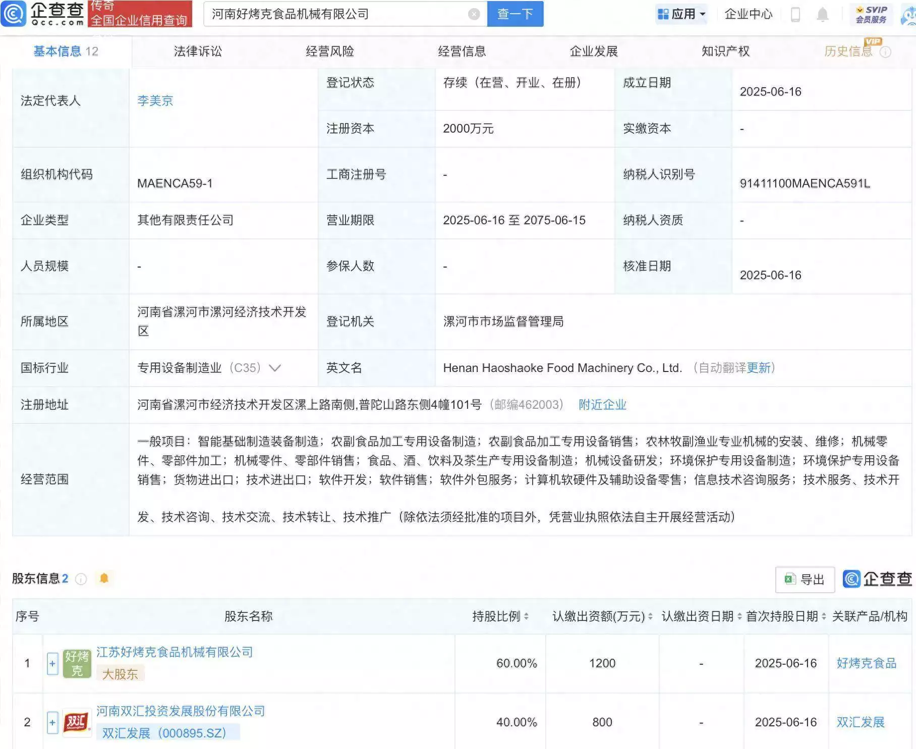 企查查APP显示,近日,河南好烤克食品机械有限公司成立,法定代表人为李美京,注册资本2000万元,经营范围包含:机械设备研发;环境保护专用设备制造;环境保护专用设备销售等。企查查股权穿透显示,该公司由双汇发展(000895)等共同持股。