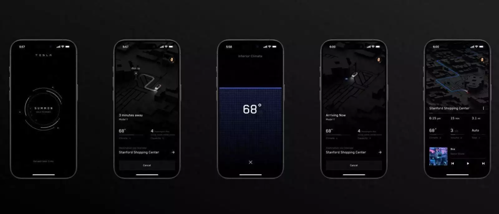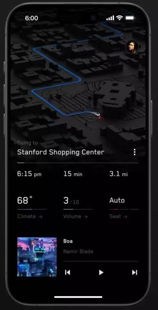 屏幕截图显示了类似 Uber 的特征,但它还包括自动驾驶车辆独有的功能,例如召唤车辆以及直接从应用程序调节温度和音乐。