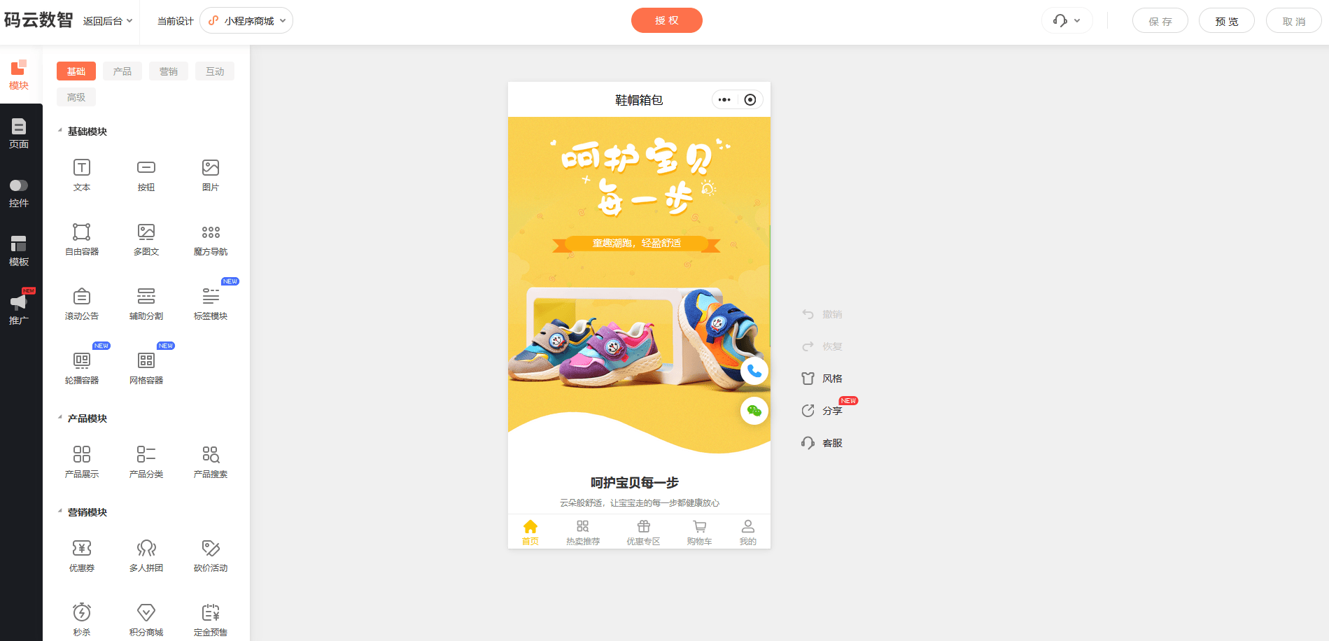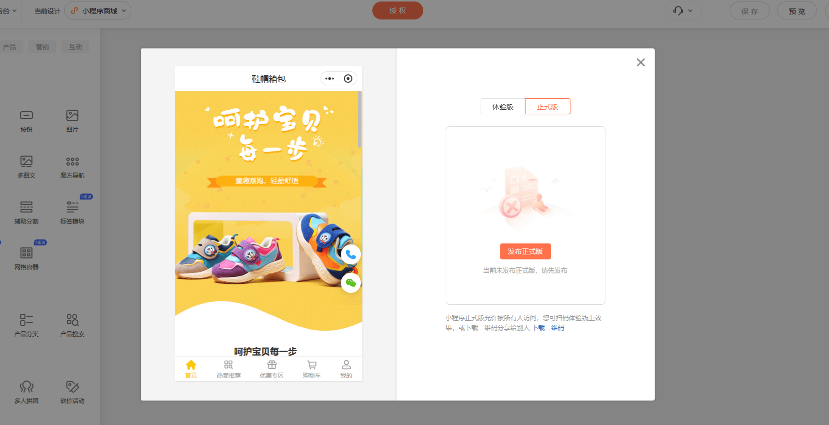 填写信息,注册完之后点击登录,然后这里进入到产品中心,我们要选择商场小程序,如果是你侧重于线上售卖产品的话,这个是最常见的一种小程序的类型。我们点击商城,这里是商城的管理后台,左边我们看到就是它的一些基本功能设置,比如说产品上架、订单管理、会员管理、分销的管理,还有各种的营销活动啊。