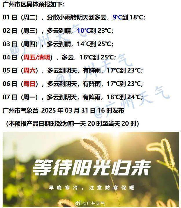 广州市气象台3月31日预计,4月1日白天起广州转阴天到多云天气,气温开始回升,但4月1日至2日广州市区日最低气温仍在9~10℃。随着气温进一步回升,4月3日至4日(清明假期首日),广州市区日最高气温有望回升至25℃。