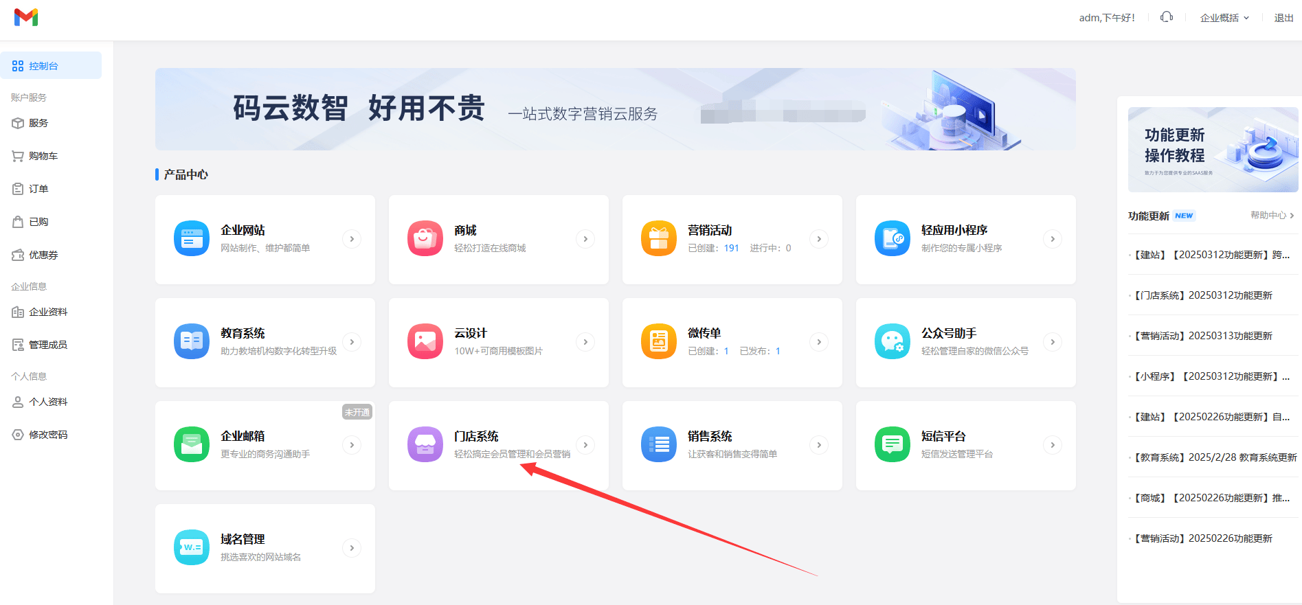 百度搜索【码云数智】,在【码云数智】平台注册账号,产品类型选择--门店系统